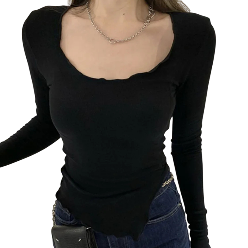 Naisten pitkähihainen T-paita Epäsymmetrinen helma ja neliönmuotoinen pääntie Elegantti T-paita laineikkaalla viimeistelyllä jokapäiväiseen käyttöön