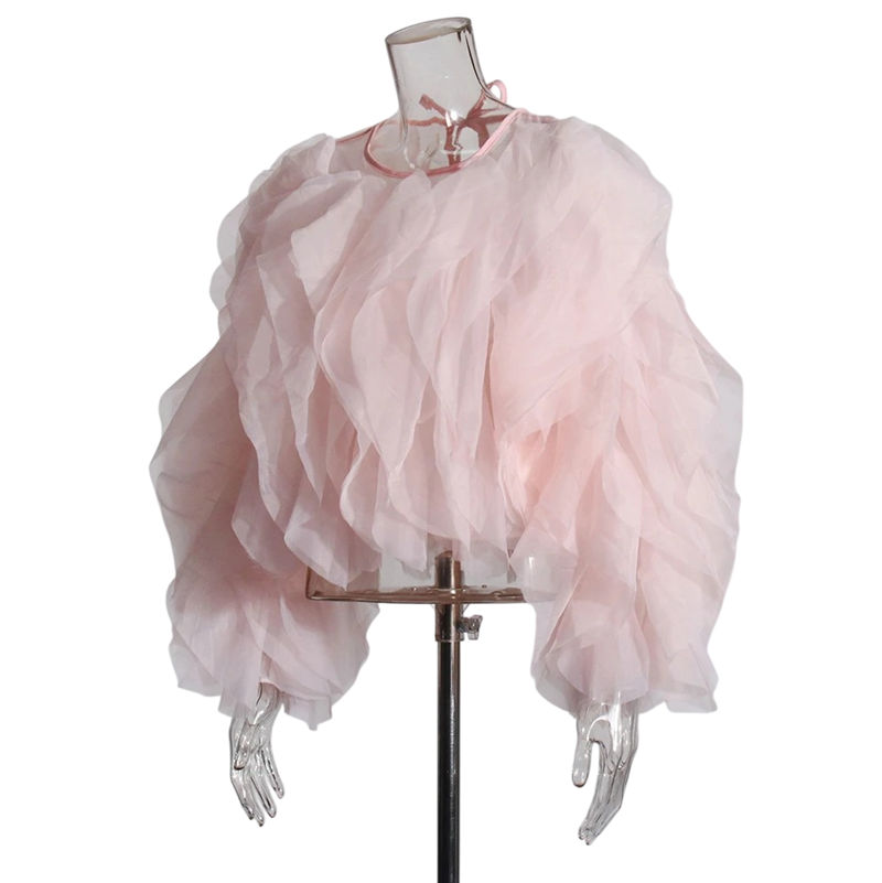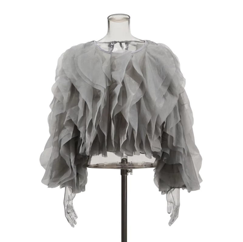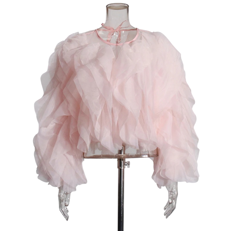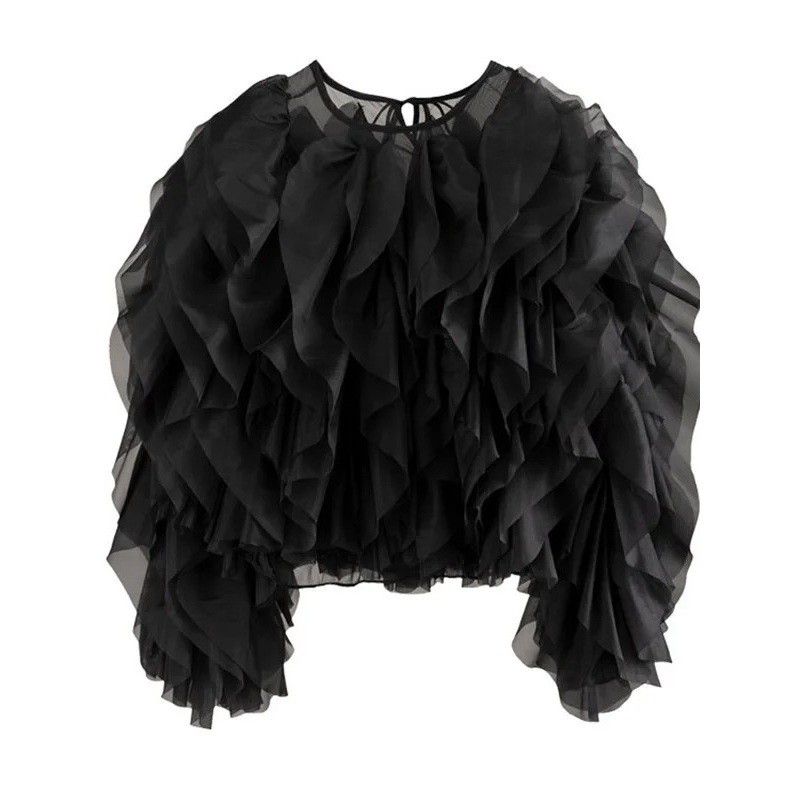 Tyylikäs naisten pitkähihaiset paita volanteilla ja solmittavalla kaula-aukolla nauhalla tuo asusteeseen hienostuneen ja naisellisen tyylin, joka sopii päivittäiseen käyttöön. Täydellinen kuvaus