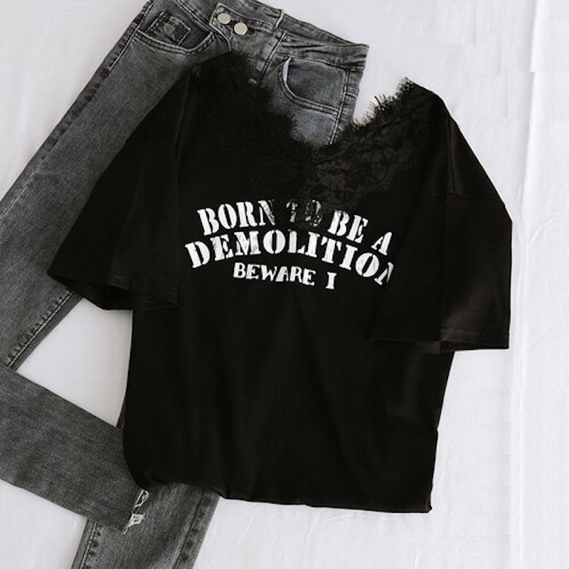 Naisten pitsinen T-paita, jossa on printti
