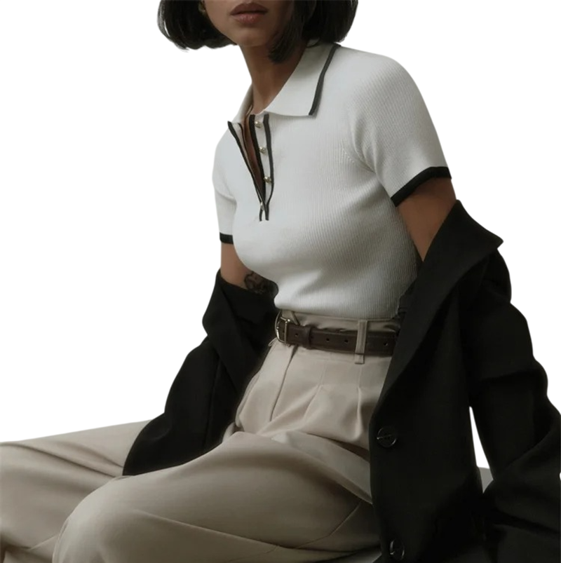 Kevyt ja mukava poolopaita naisille V-pääntiellä, kauluksella ja napilla. Ihanteellinen työhön, vapaa-aikaan ja kesäaktiviteetteihin. Täydellinen kuvaus