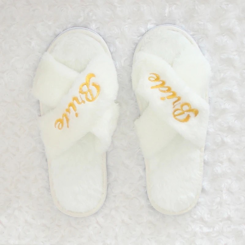 Valkoiset pörröiset tossut, joissa on teksti Bride. Mukava ja tyylikäs lisä morsiamelle polttareihin. Täydellinen kuvaus