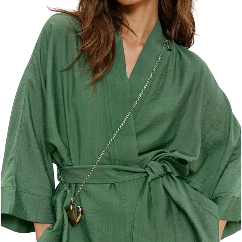 Tämä naisten pyjamakokonaisuus tyylikkäässä vihreässä värissä on täydellinen yhdistelmä mukavuutta, tyyliä ja käytännöllisyyttä. Valmistettu miellyttävästä sekoituksesta puuvillaa ja nailonia, se tarjoaa pehmeyttä, hengittävyyttä ja hienoa kiiltoa, mikä tekee siitä ihanteellisen viileisiin iltoihin ja mukavaan rentoutumiseen kotona. Pyjama koostuu pitkähihhaisesta aamutakista, joka sidotaan kankaisella nauhalla, sekä yhteensopivista väljästi leikatuista housuista. Tämä muotoilu on rento ja samalla naisellinen – täydellinen naisille, jotka arvostavat eleganssia myös kotona.