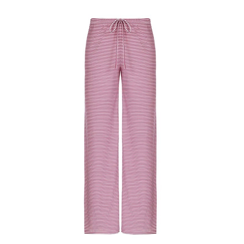 Vapaa-ajan naisten housut, joissa on raidallinen kuvio, joustava vyötärö ja nyöritys. Ihanteelliset jokapäiväiseen käyttöön lämpimällä säällä. Täydellinen kuvaus