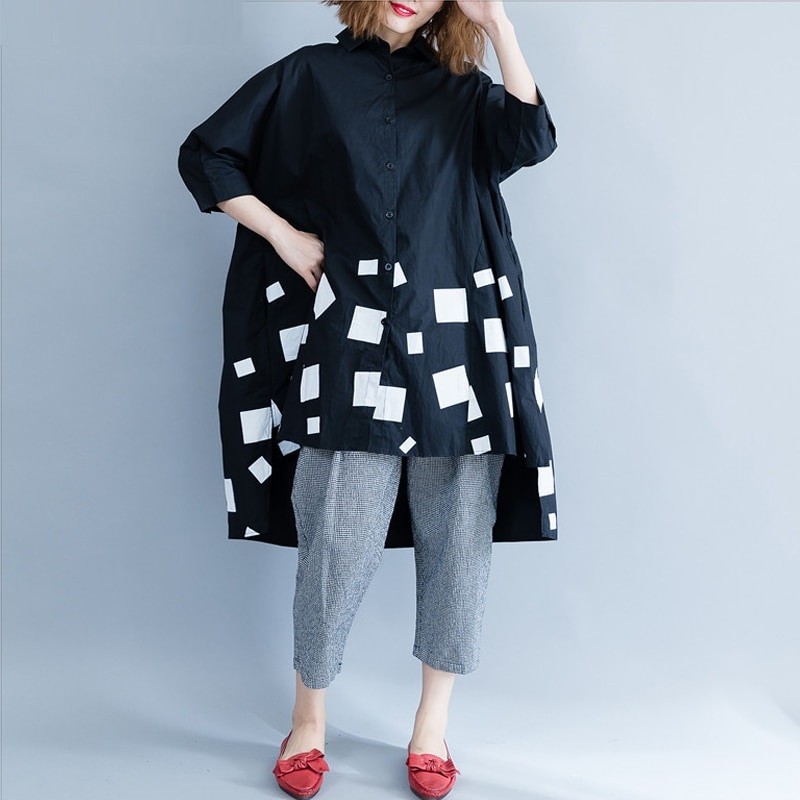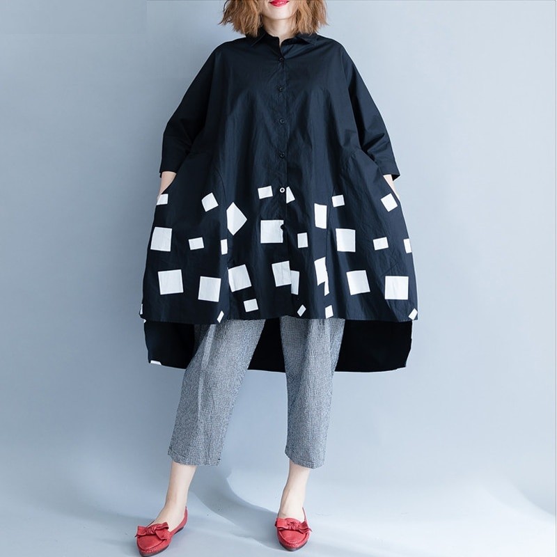 Musta väljä paita, jossa valkoinen ruutukuvio.