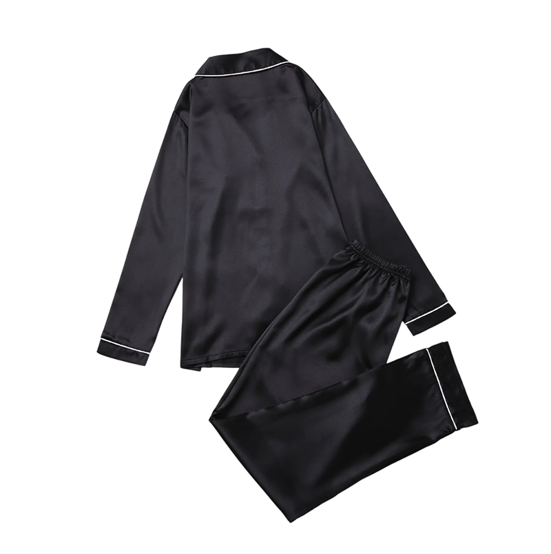 Tämä tyylikäs pyjamakokonaisuus on suunniteltu naisille, jotka haluavat yhdistää mukavuuden ja tyylin yhdessä asussa. Samettimateriaali polyesteristä ja spandeksista tarjoaa poikkeuksellisen miellyttävän tunteen iholla ja näyttää ylelliseltä. Napitus klassisella kauluksella antaa mallille hienostuneisuutta ja rintatasku käytännöllisen yksityiskohdan. Housujen joustava vyötärö takaa liikkuvuuden ja mukavuuden koko illan ajan. Tyylikkään leikkauksen ja kiiltävän pinnan ansiosta tämä kokonaisuus on täydellinen ei vain nukkumiseen, vaan myös tyylikkäänä kotiasuna. Se on täydellinen lahja jokaiselle naiselle, joka arvostaa laatua, eleganssia ja mukavuutta.