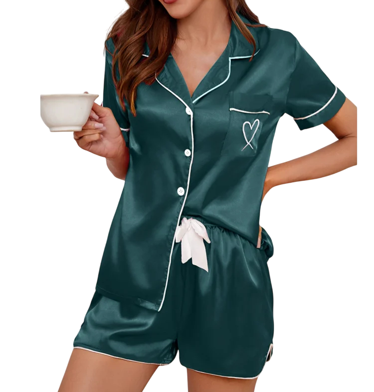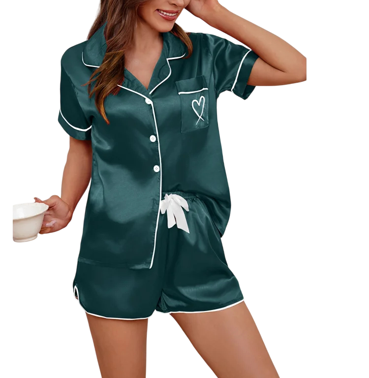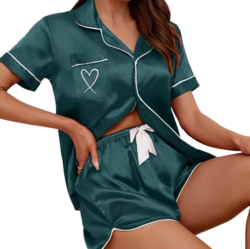 Tyylikäs naisten samettinen pyjama V-pääntiöllä, lyhyillä hihoilla ja napeilla. Pehmeä ja joustava materiaali takaa maksimaalisen mukavuuden ja tyylin. Täydellinen kuvaus