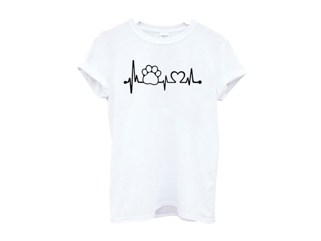 Kaunis naisten T-paita, jossa on sydämenlyöntikuvio ja koiran tassu koiran ystäville.