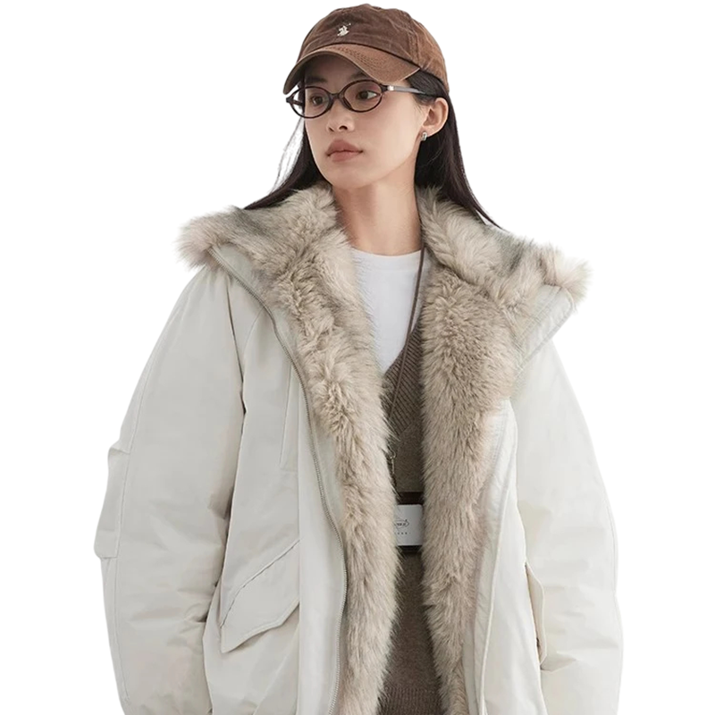 Lämmin polyesterinen talvitakki turkislippailla, vetoketjukiinnityksellä ja käytännöllisillä taskuilla tarjoaa mukavuutta, tyyliä ja suojaa kylmässä säässä. Täydellinen kuvaus