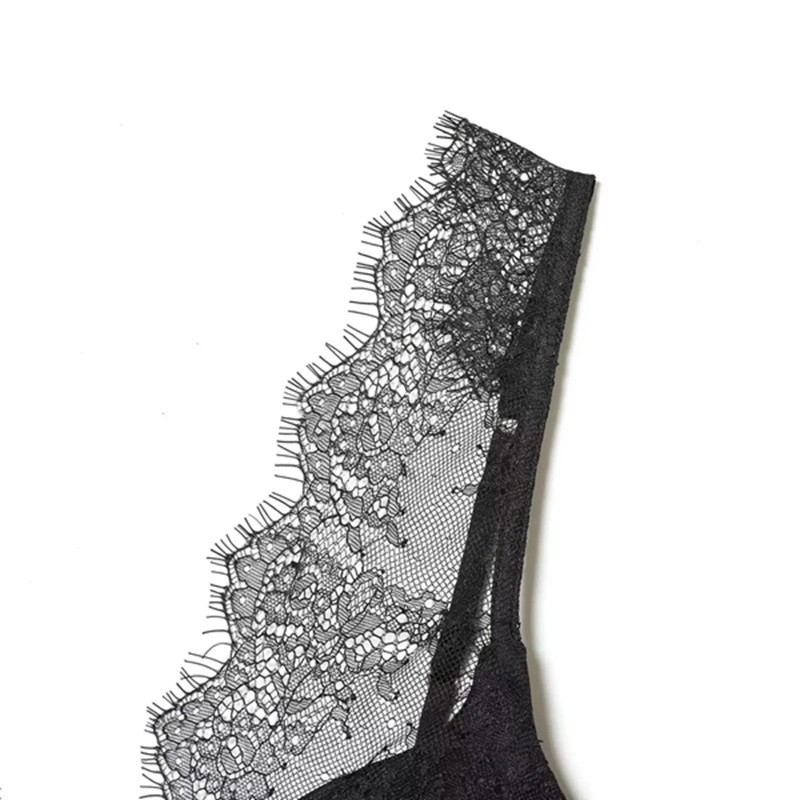 Elegantti naisten toppi V-pääntiellä ja ohutolkaimilla, musta yksivärinen malli pitsillä kevyestä polyesteristä. Täydellinen kuvaus