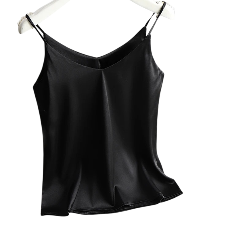 Tyylikäs naisten toppi V-pääntiellä ja ohutolkaimilla, yksivärinen toteutus hienosta polyesteri- ja silkki-sekoituksesta. Täydellinen kuvaus