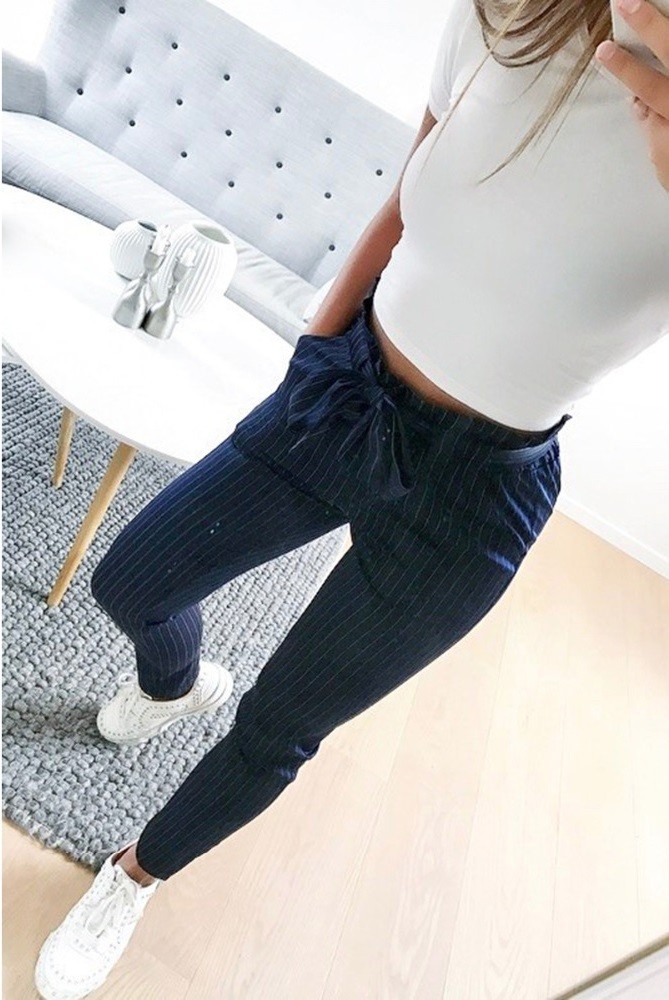 Ole tyylikäs näissä raidallisissa housuissa, joissa on polyesterivyö, joka täydentää housujen yleisilmettä.