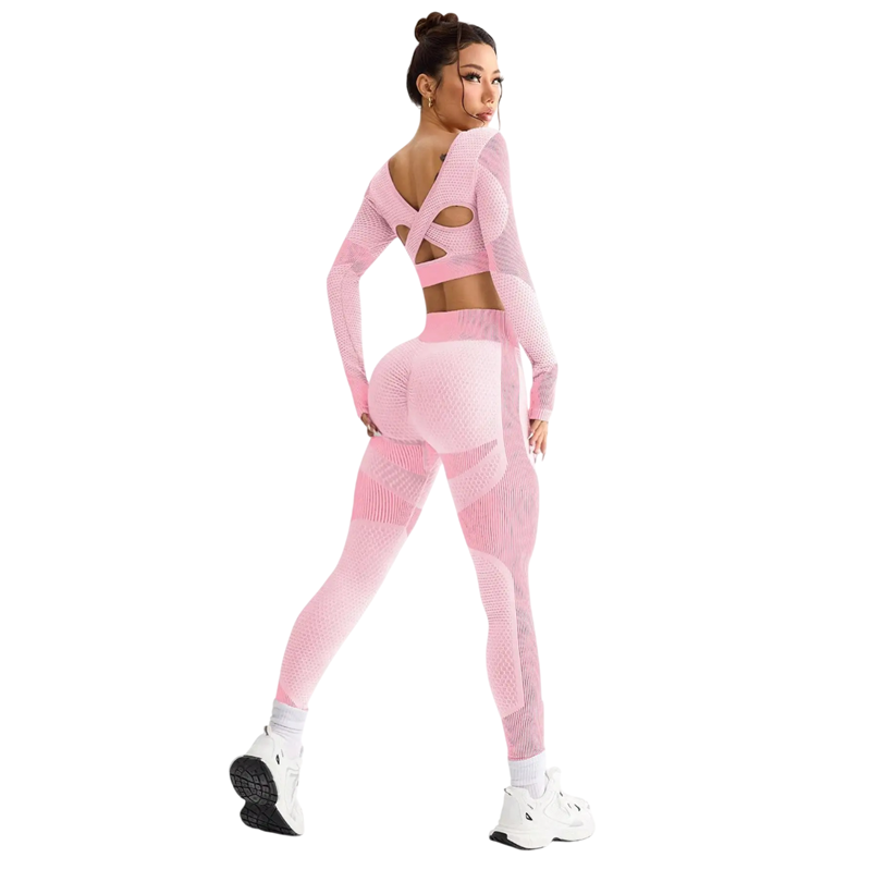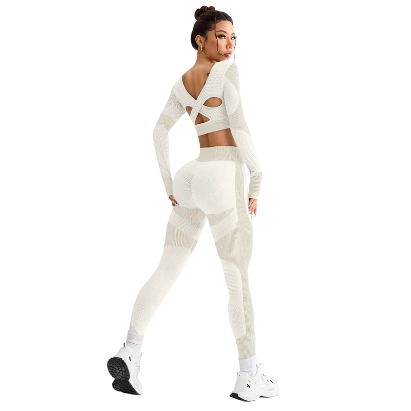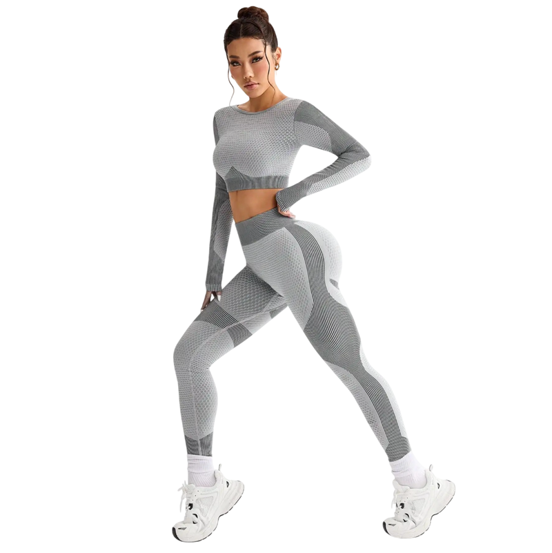 Tämä moderni naisten urheiluasu on suunniteltu maksimaalista mukavuutta ja tyyliä varten jokaisessa liikkeessä. Yhdistelmä tiukkoja leggingssejä ja pitkähihasta crop-topia luo elegantin ja urheilullisen ilmeen, joka sopii fitnessiin, joogaan ja arkikäyttöön. Materiaali on kevyt, joustava ja miellyttävä kosketuksessa, minkä ansiosta asu mukautuu täydellisesti vartaloon. Yhdisteinen muotoilu on ajaton ja helppo yhdistää muiden urheiluvarusteiden kanssa.