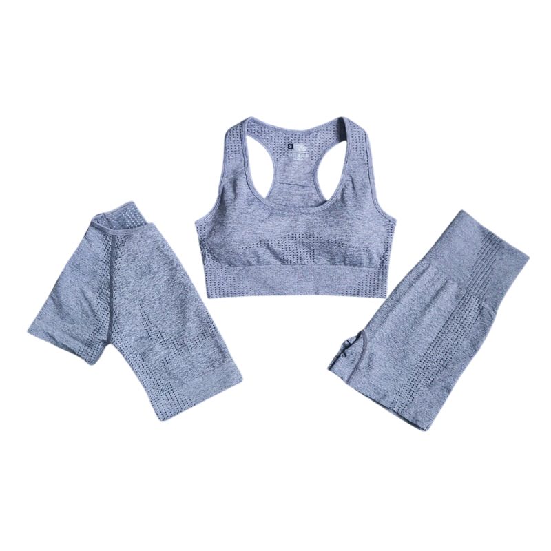Tämä naisten urheiluasu on suunniteltu käytännölliseksi ja toimivaksi setiksi aktiivisille naisille, jotka haluavat täydellisen asun urheiluun ja vapaa-aikaan. Yhdistelmä lyhyitä housuja, urheiluliivejä ja lyhythihasta paitaa tarjoaa maksimaalista mukavuutta, liikkumisvapautta ja modernia urheilullista ilmettä. Materiaali, joka koostuu nylonista, polyesteristä ja spandexista, on kevyt, joustava ja erittäin miellyttävä koskettaa. Yksivärinen toteutus on ajaton ja helposti yhdistettävissä muihin urheiluvarusteisiin.
