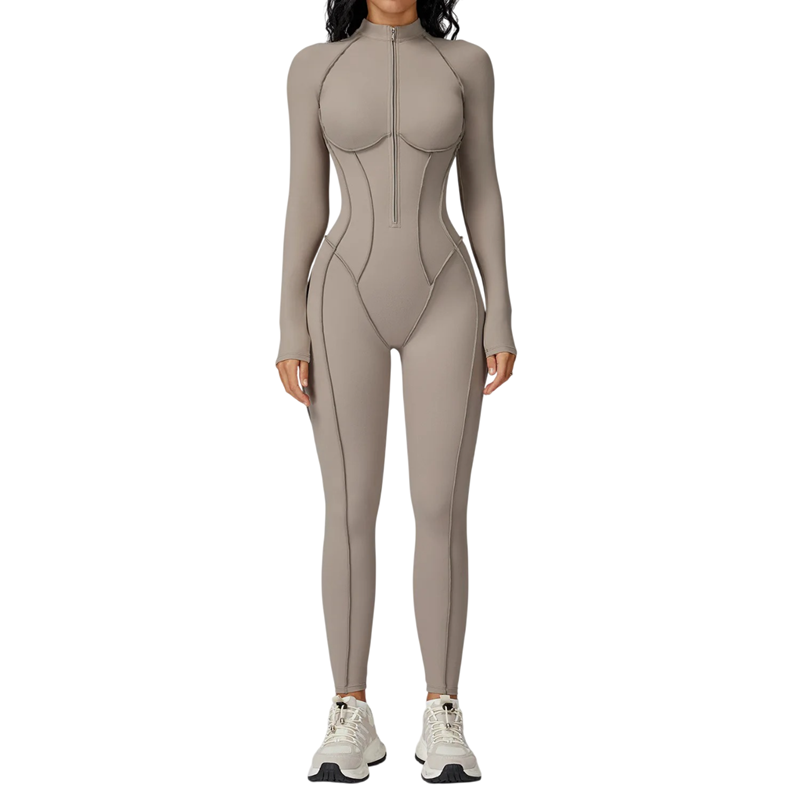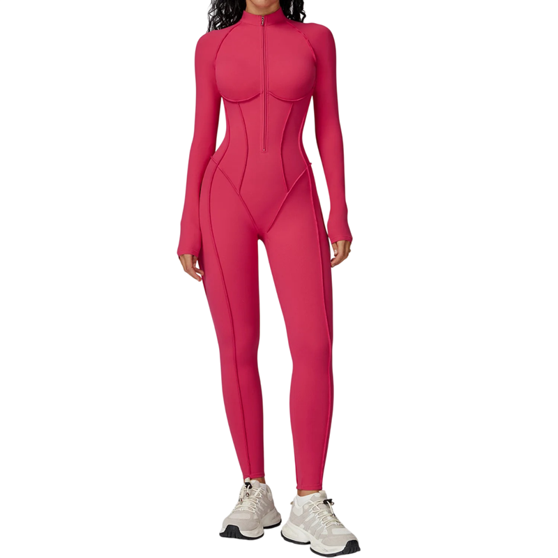Moderni naisten urheilullinen haalari, joka sopii fitnessiin ja joogaan, joustava materiaali vetoketjulla pääntiessä tarjoaa mukavuutta, tukea ja tyylikästä ilmettä. Täydellinen kuvaus