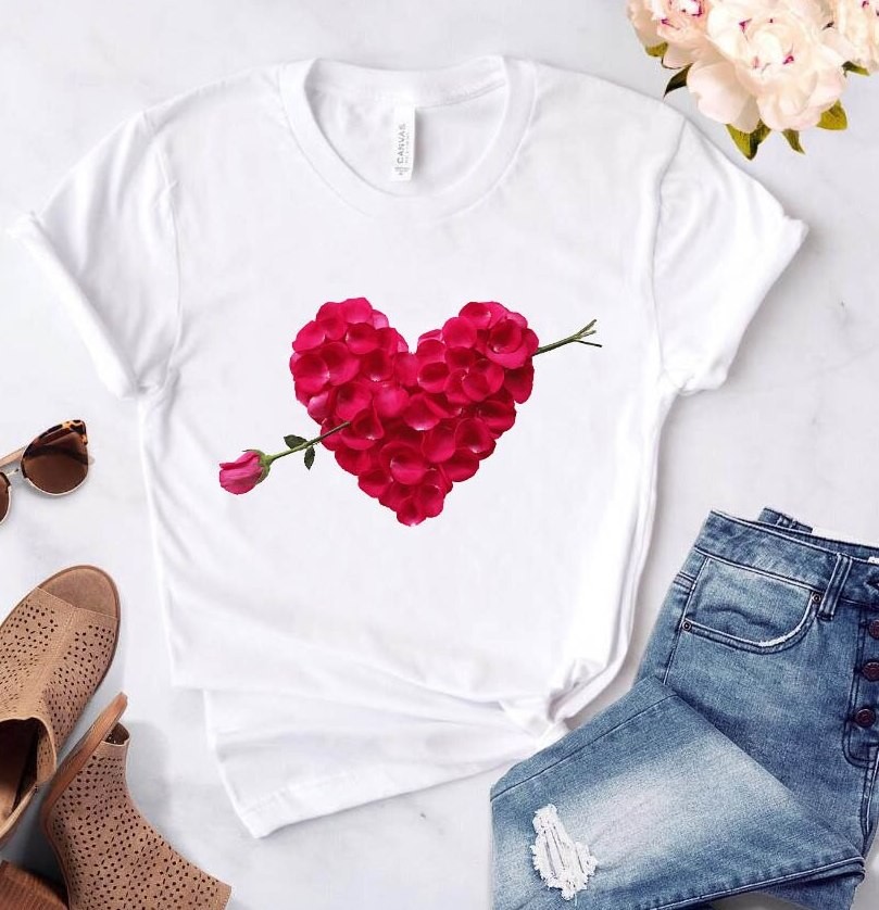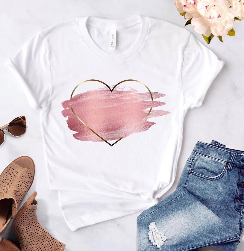 Naisten valkoinen t-paita, jossa sydänkuvio