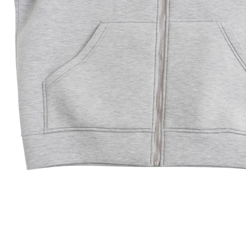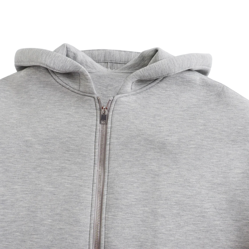 Tyylikäs harmaa huppari vetoketjulla ja hupulla pehmeästä puuvillasta, täydellinen vapaa-aikaan, matkustamiseen ja päivittäiseen käyttöön modernissa designissa. Täydellinen kuvaus