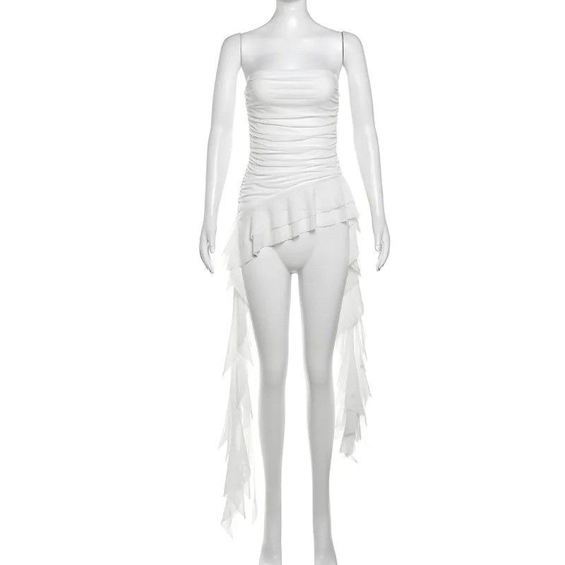 Tyylikäs naisten toppi ilman olkaimia, jossa on pitkät frillat sivuilla, tarjoaa joustavaa materiaalia, keveyttä ja naisellista ilmettä kesäksi. Täydellinen kuvaus