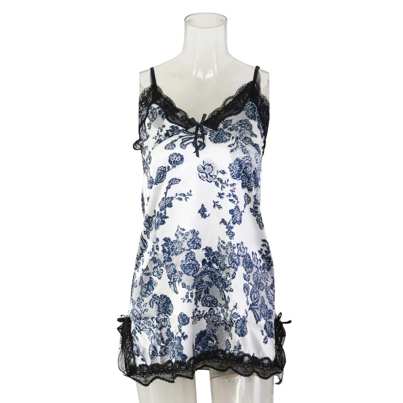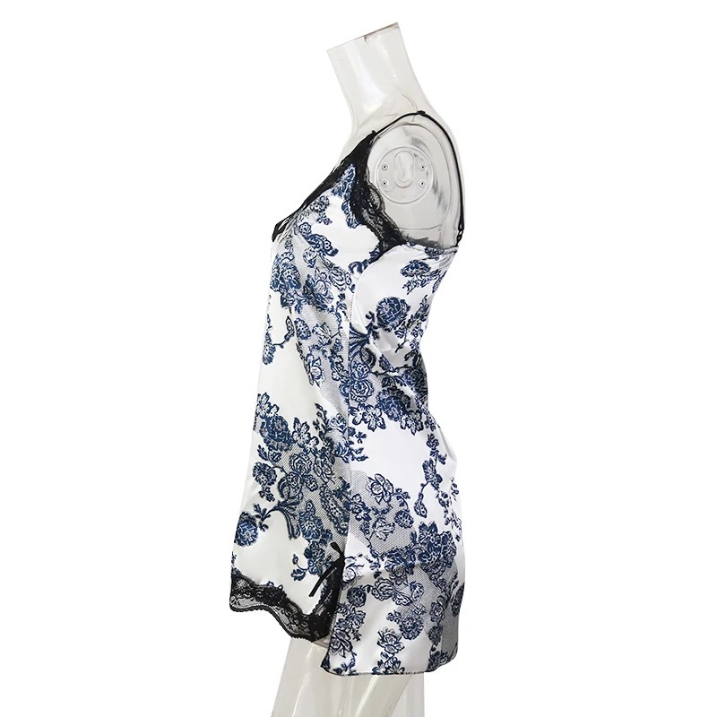 Naisten yömekko valkoinen mustilla kukilla Tyylikäs yöpaita pitsillä ja halkiolla V-pääntie Kevyt polyesteri Mukava yömuoti