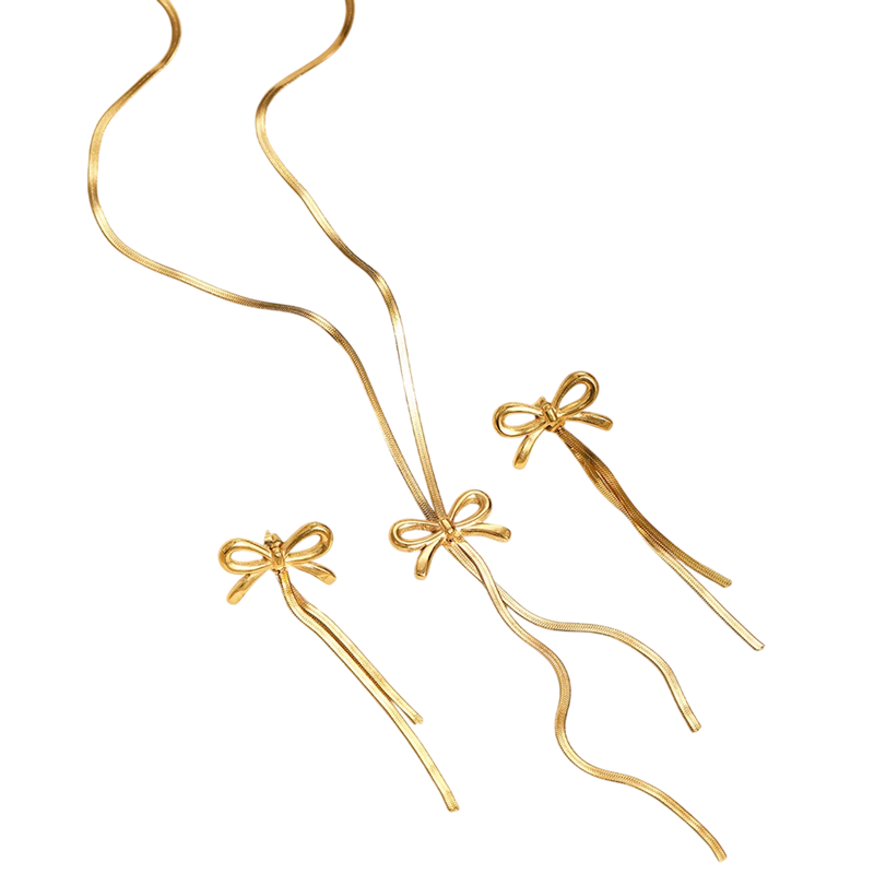 Tämä hieno kaulakoru- ja korvakorusetti erottuu romanttisella muotoilullaan, jossa on hillitty nauha, joka on inspiroitunut ranskalaisesta eleganssista. Korut näyttävät kevyiltä, hienostuneilta ja samalla moderneilta, joten ne voivat helposti tulla osaksi jokapäiväistä tyyliä sekä juhlallisempia asuja. Kaulakoru korostaa kaulan linjaa kauniisti, ja pidennettävän ketjun ansiosta pituutta voidaan säätää tarpeen mukaan. Ilmeikkäät roikkuvat korvakorut antavat koko setille säihkettä ja naisellista viehätystä. Tämä nauha-naisten korusetti ruostumatonta terästä on täydellinen valinta naisille, jotka rakastavat hienoja mutta mieleenpainuvia asusteita.