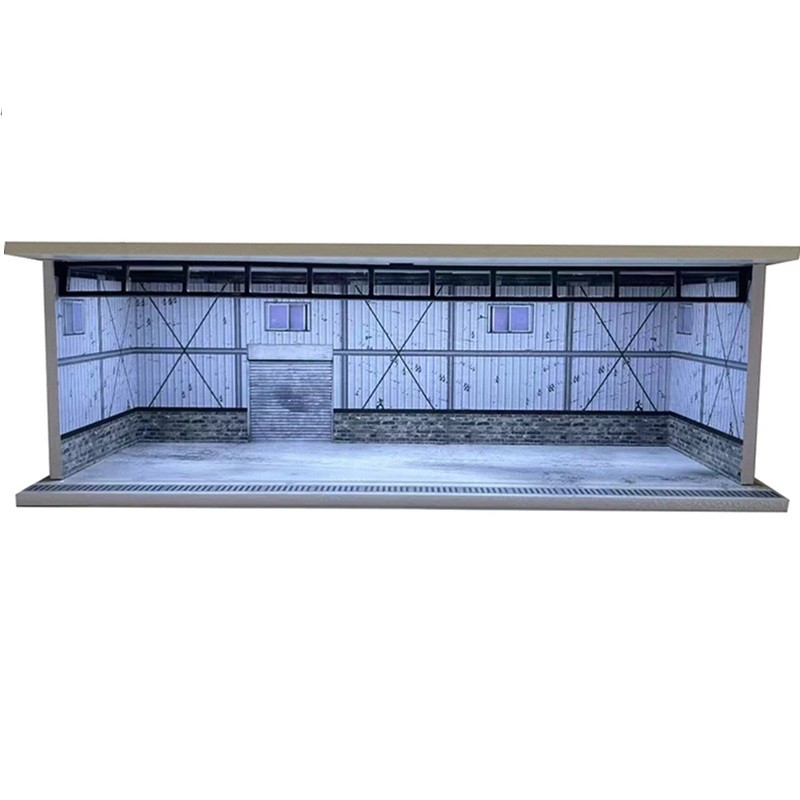Yksityiskohtaisesti valmistettu mallinnusdiorama esittelee realistisen metalli huoltorakennuksen rullaporteilla, joka luo autenttisen ympäristön autojen mallien esittelyyn. Diorama on suunniteltu suositussa mittakaavassa 1:64, mikä tekee siitä täydellisen useimpien keräilymallien kanssa. Rakenne yhdistää laadukkaita materiaaleja, jotka takaavat pitkän käyttöiän ja korkean yksityiskohtaisuuden tason. Teollinen ilme täydentää tumma kiviraita ja realistinen pysäköintialue.