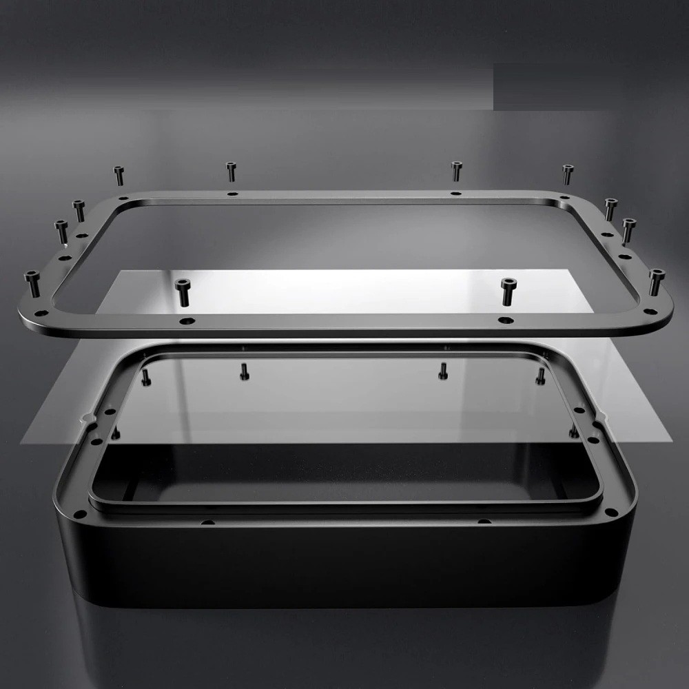 1. Irrota kaikki ruuvit astian alapuolelta ja irrota varovasti metallikehys. 2. Aseta uusi NFEP-folio kahden metalliosan väliin niin, että se on suora ja ilman jännitystä. 3. Aseta kehys takaisin astiaan ja ruuvaa se vähitellen kiinni, jotta folio on tasaisesti kireä koko ympärykseltään. 4. Leikkaa ylimääräinen folion reuna terävällä työkalulla. Nyt folio on valmis tulostettavaksi.
