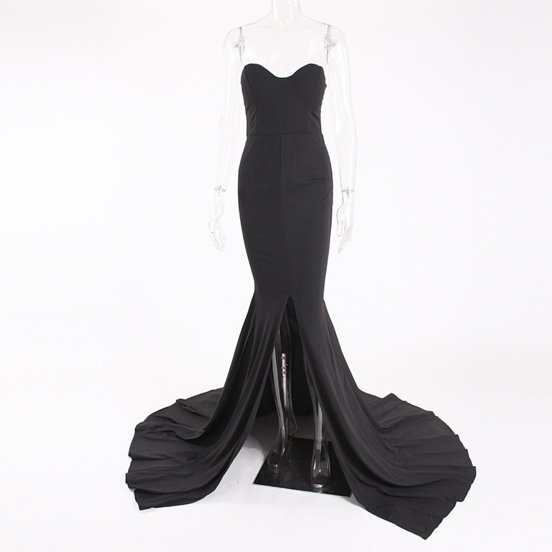 Naisten mekko, jossa on laahus ja paljaat olkapäät.