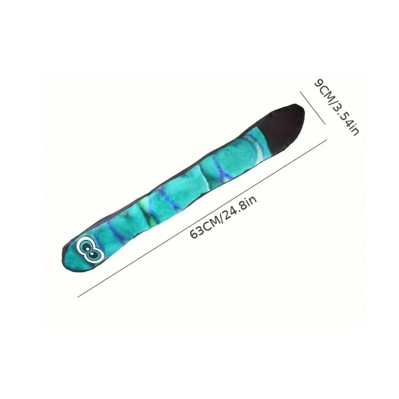 Kestävä pehmolelu pitkän käärmeen muodossa, jossa on silmät ja vinkuva, sopii koirien purentaharjoitteluun. Täydellinen kuvaus