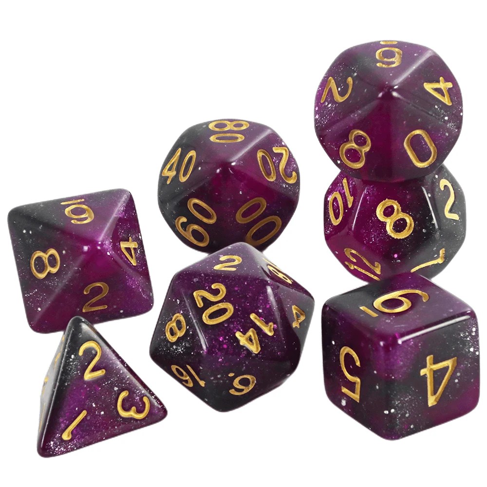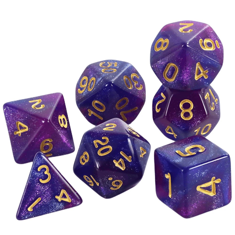 Monivärinen setti monikulmaisista noppista galaksi tyyliin RPG- ja fantasiapeleihin, täydellinen Lohikäärme luolaan ja pöytäroolipeleihin. Täydellinen kuvaus