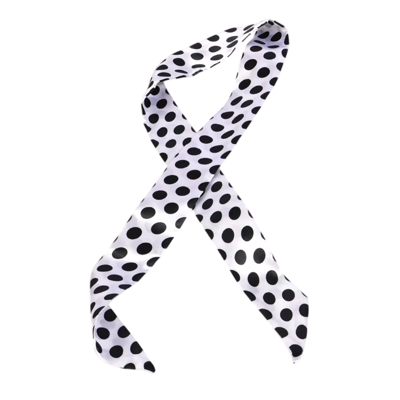 Tyylikäs pilkkukuvioinen huivi, jota voi käyttää hiuksissa, pään ympärillä tai laukun koristeena. Kevyt, kapea ja monikäyttöinen muotilisäke. Täydellinen kuvaus
