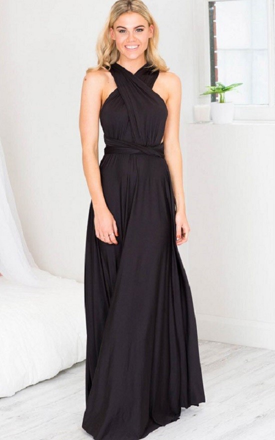 Pitkä juhlamekko, jossa avoin selkä