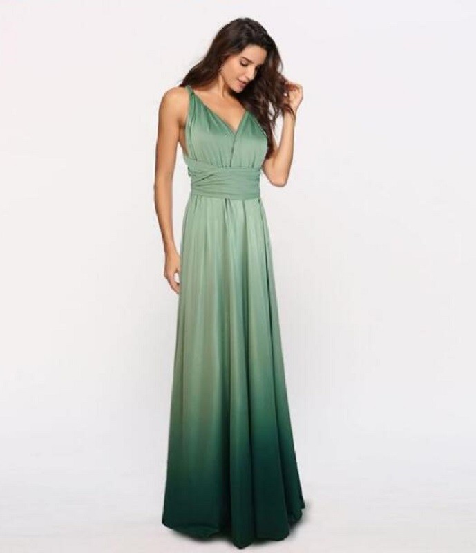 Kaunis pitkä iltapuku pehmeästä, kiiltävästä materiaalista.