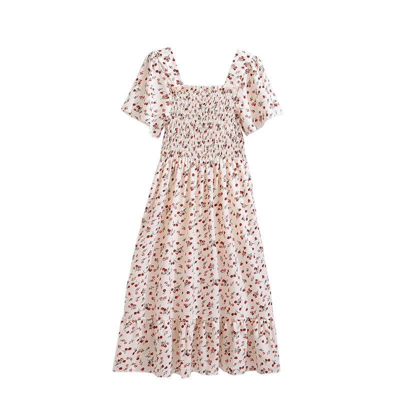 Tämä romanttinen mekko yhdistää mukavuuden ja eleganssin ja sopii lähes mihin tahansa tilaisuuteen lämpiminä päivinä. Rypytetty yläosa mukautuu erilaisiin vartalon muotoihin pitäen mekon paikallaan ilman lisäsäätöjä. Kukka-aihe näyttää raikkaalta ja tyylikkäältä, mitä jokainen naisellisesta tyylistä pitävä nainen arvostaa. Neliömäinen pääntie on tyylikäs ja trendikäs samaan aikaan. Röyhelöyksityiskohta tuo keveyttä jokaiseen askeleeseen ja tekee tästä mekosta täydellisen valinnan kesään.