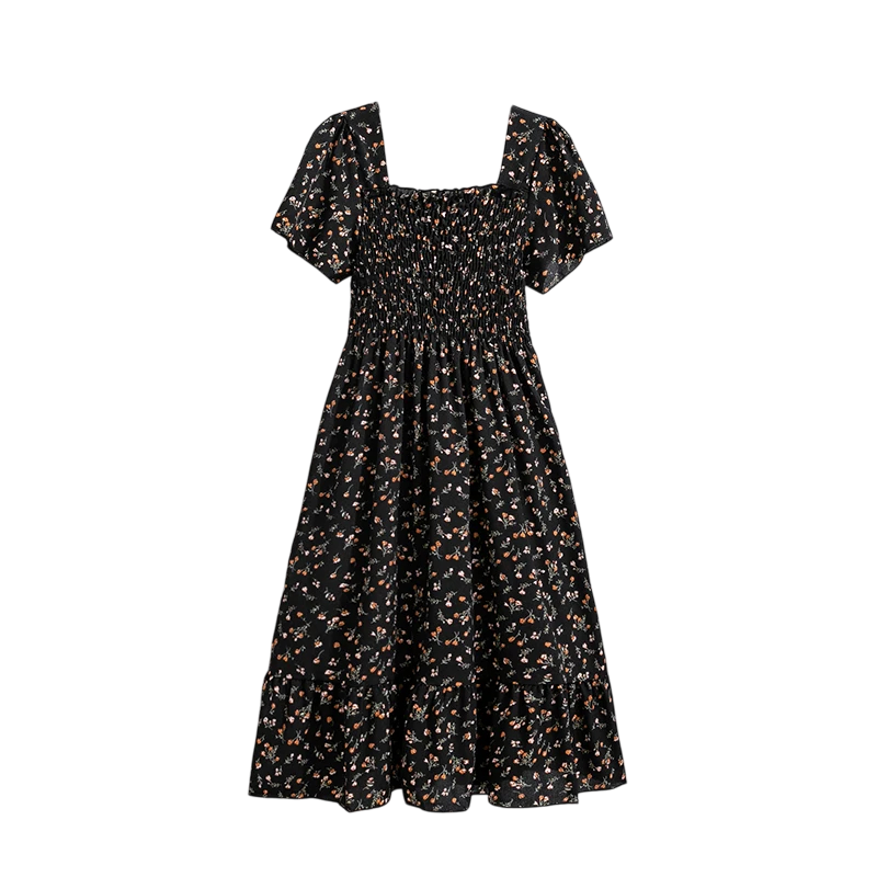 Etusivu Etusivu Vaatteet ja asusteet Naisten vaatteet Naisten mekot Naisten midimekot Pitkä kukkakuvioinen mekko, jossa röyhelöinen yläosa ja helma. Romanttinen kesämekko, jossa lyhyet hihat ja neliönmuotoinen pääntie.
