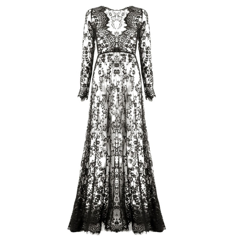 Pitkä pitsinen maksimekko, jossa pitkät hihat ja syvä pääntie.