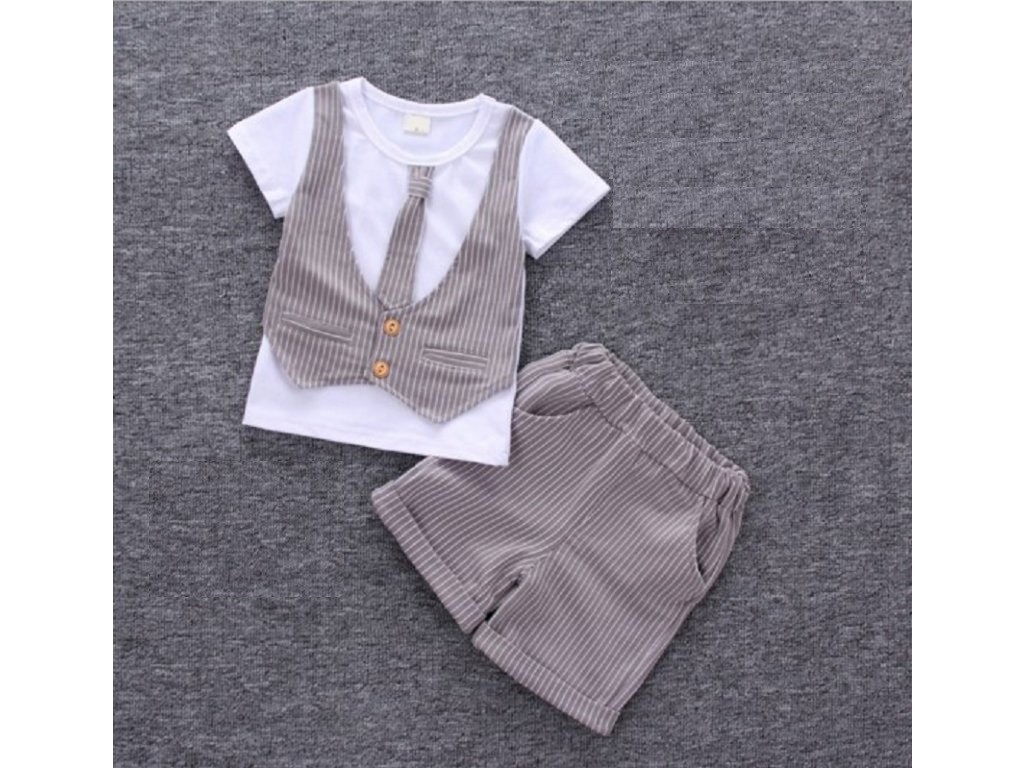 Tämä setti sisältää puvun ja solmion painatuksella varustetun t-paidan sekä shortsit.