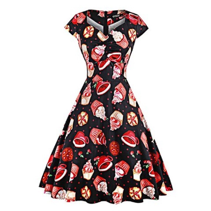 Naisten kesämekko, jossa levenevä hame ja lyhyet hihat.