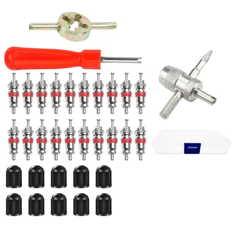 • Kattava 33-osainen sarja renkaiden venttiilien korjaukseen ja huoltoon autoissa, moottoripyörissä ja polkupyörissä.