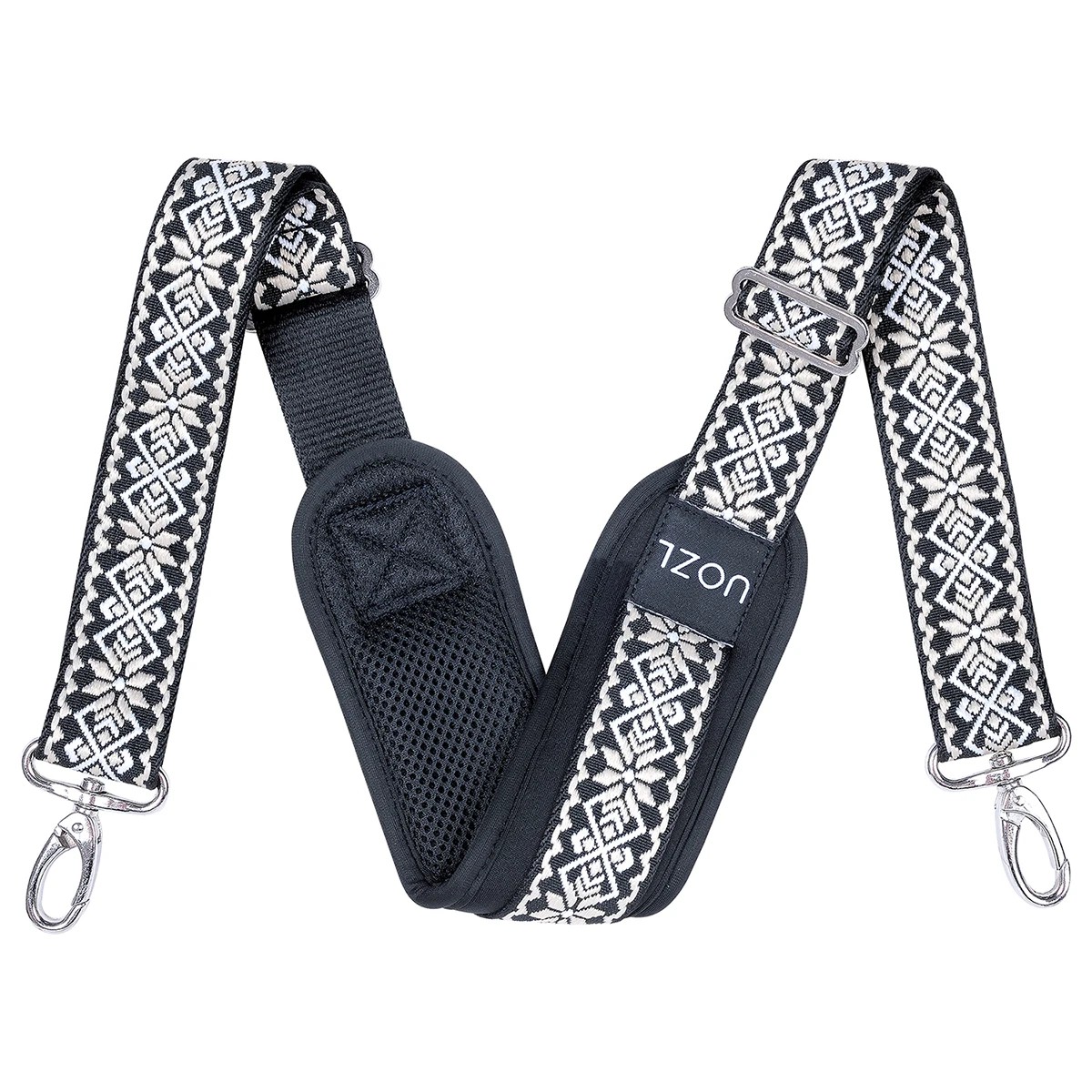 Säädettävä käsilaukkuhihna 150 cm Mustavalkoinen geometrinen kuvio Laaja tekstiilinen olkahihna Pehmustettu osa Karabiinikiinnitys