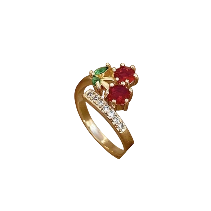 Tyylikäs lisävaruste kirsikkateemalla, joka on koristeltu kimaltelevilla kivillä, mukautuu mukavasti sormille. Sopii päivittäiseen käyttöön sekä juhlatilaisuuksiin. Täydellinen kuvaus
