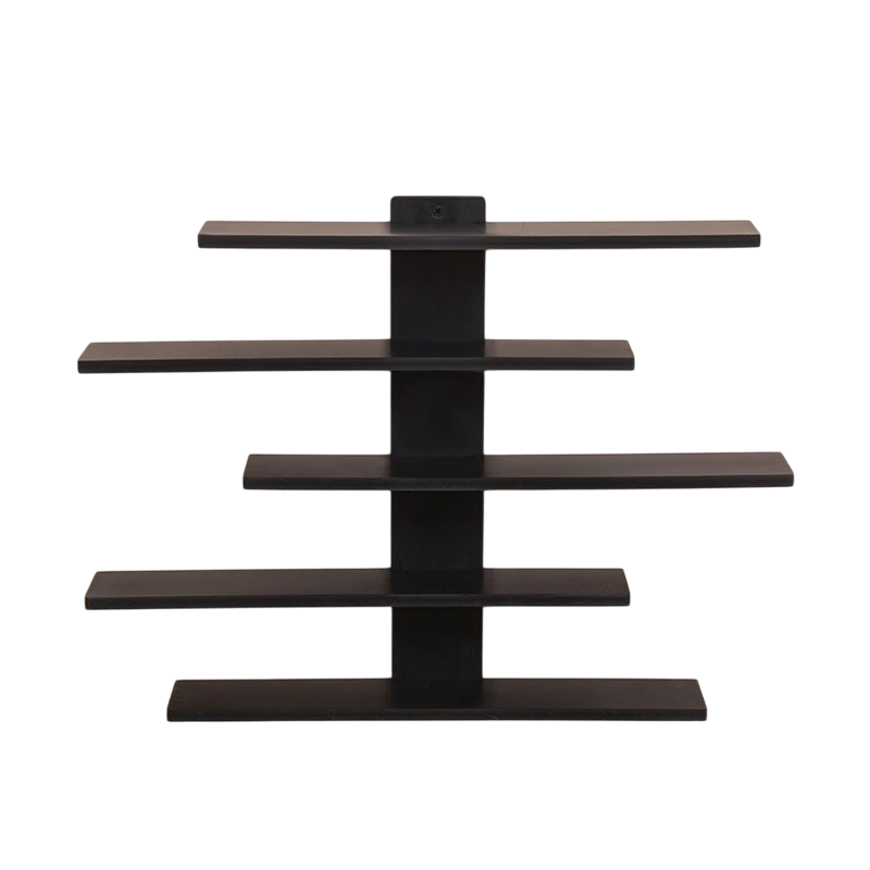 Tyylikäs seinäteline viidellä kapealla hyllyllä on täydellinen koristeiden, maustepurkkien, kynsilakkojen tai miniatyyrejen esittelyyn. Täydellinen kuvaus