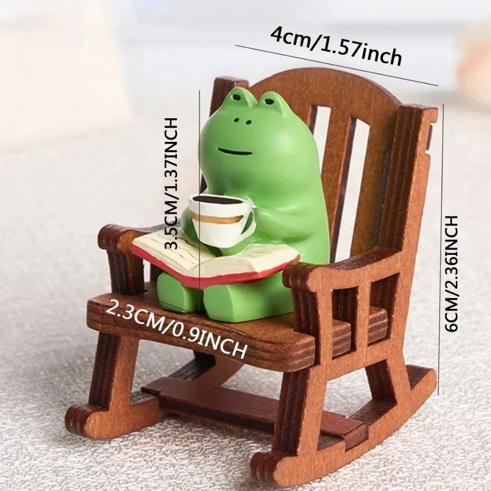 Japanilainen pieni koriste, koko 6 x 4 cm. Muovinen sammakko istuu tuolilla mukin ja kirjan kanssa, tuoden söpöä ilmettä pöydälle tai hyllylle. Täydellinen kuvaus