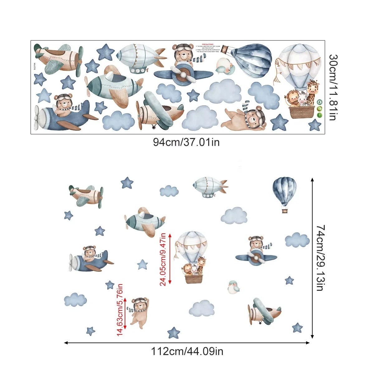 Seinästickeri 112 x 74 cm Eläimiä lentokoneissa ja ilmapalloissa Läpinäkyvä mattapintainen vinyyli Lastenhuoneen koriste Leikkisä seinäkoriste