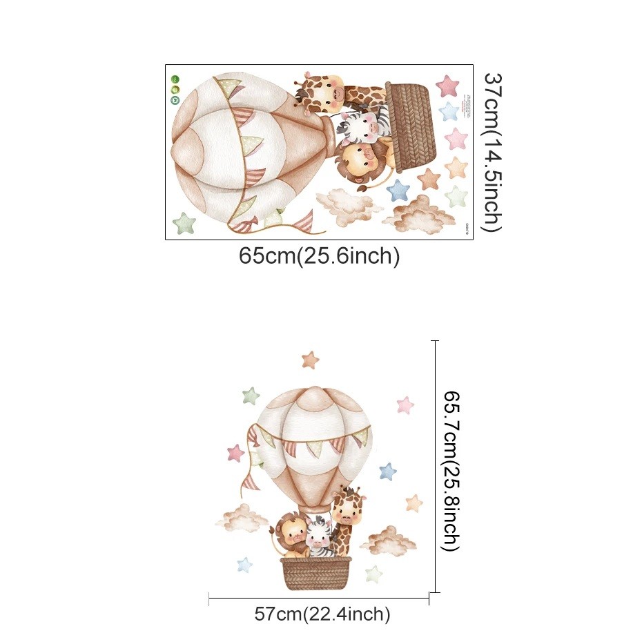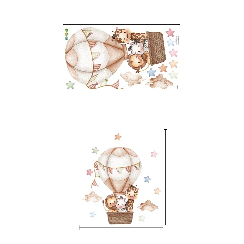 Söpö leijonan, zebran ja kirahvin kuvasto ruskeassa ilmapallossa tuo leikkisyyttä lastenhuoneeseen. Laadukas vinyl, helppo asennus ja pehmeät värit luovat miellyttävän ilmapiirin. Täydellinen kuvaus