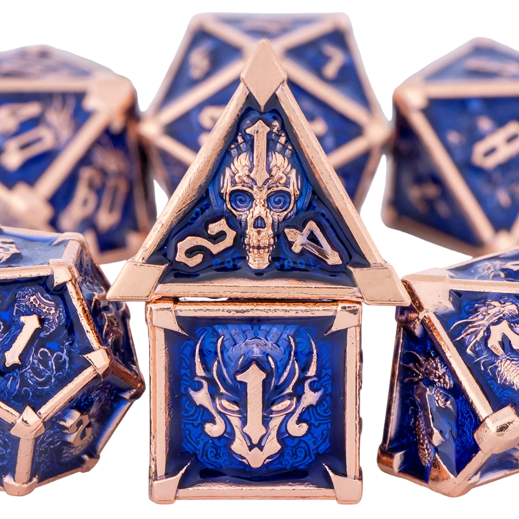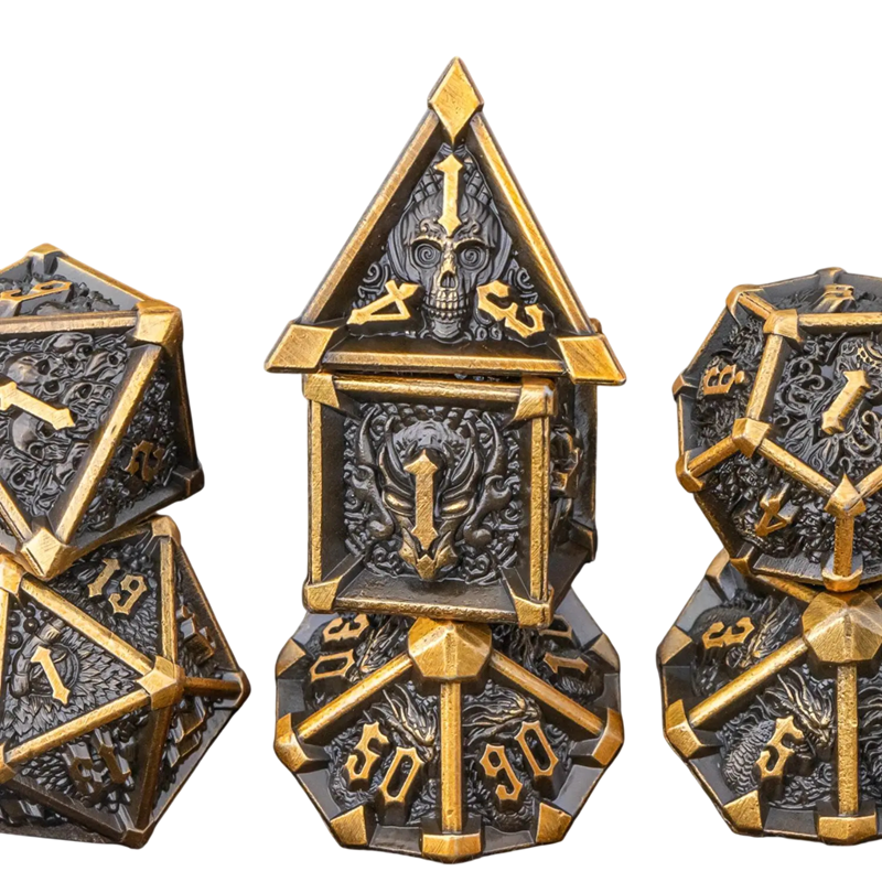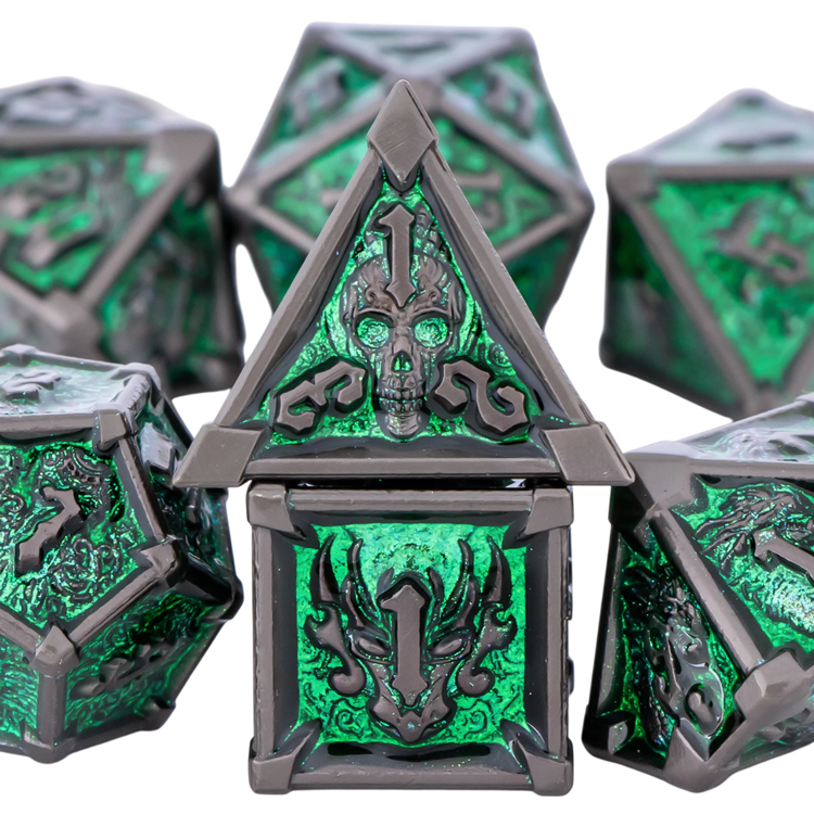 Tämä teemallinen pelikuutiosetti on suunniteltu lautapeleihin ja roolipeleihin, joissa korostuu voimakas visuaalinen tyyli. Setti sisältää 7 kpl pelikuutioita, jotka muodostavat standardiyhdistelmän, jota käytetään RPG-järjestelmissä ja Lohikäärmepesä-tyyppisissä peleissä. Tumman fantasian pääkallamotiivi antaa kuutioille ainutlaatuisen luonteen ja tukee pelimaailman tunnelmaa.