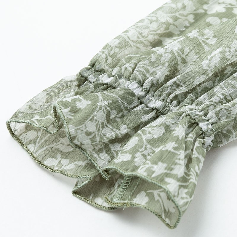 Koristeltu röyhelöllä pääntiessä ja hameessa.