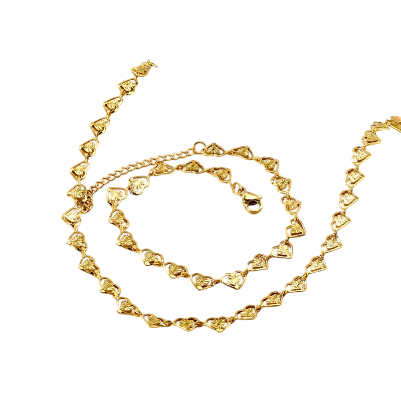 Tyylikäs korusetti sydänaiheella on täydellinen valinta naisille ja tytöille, jotka haluavat korostaa hienostunutta ja romanttista tyyliään. Setti sisältää kaulakorun ja rannekorun, jotka muodostavat täydellisesti yhdistelevän kokonaisuuden, sopien niin päivittäiseen käyttöön kuin juhlavampiin tilaisuuksiin. Korut on valmistettu korkealaatuisesta ruostumattomasta teräksestä, joka on vahva, kestävä ja säilyttää pysyvän kiillon ilman tummumista. Hypoallergeenisten ominaisuuksiensa ansiosta setti on turvallinen herkälle iholle ja mukava myös koko päivän käyttöön. Ajaton sydämen muoto symboloi rakkautta ja eleganssia ja täydentää helposti mitä tahansa asua.