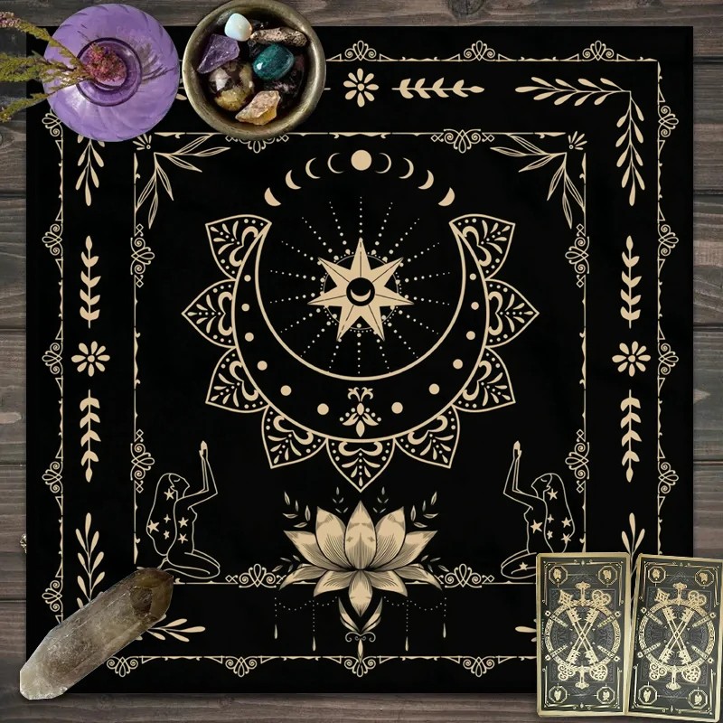 Tyylikäs musta pöytäliina tarot-motiiveilla ennustamiseen, alttarille tai kodin sisustukseen. Ihanteellinen esoteriikan ja mystisen tunnelman ystäville. Täydellinen kuvaus