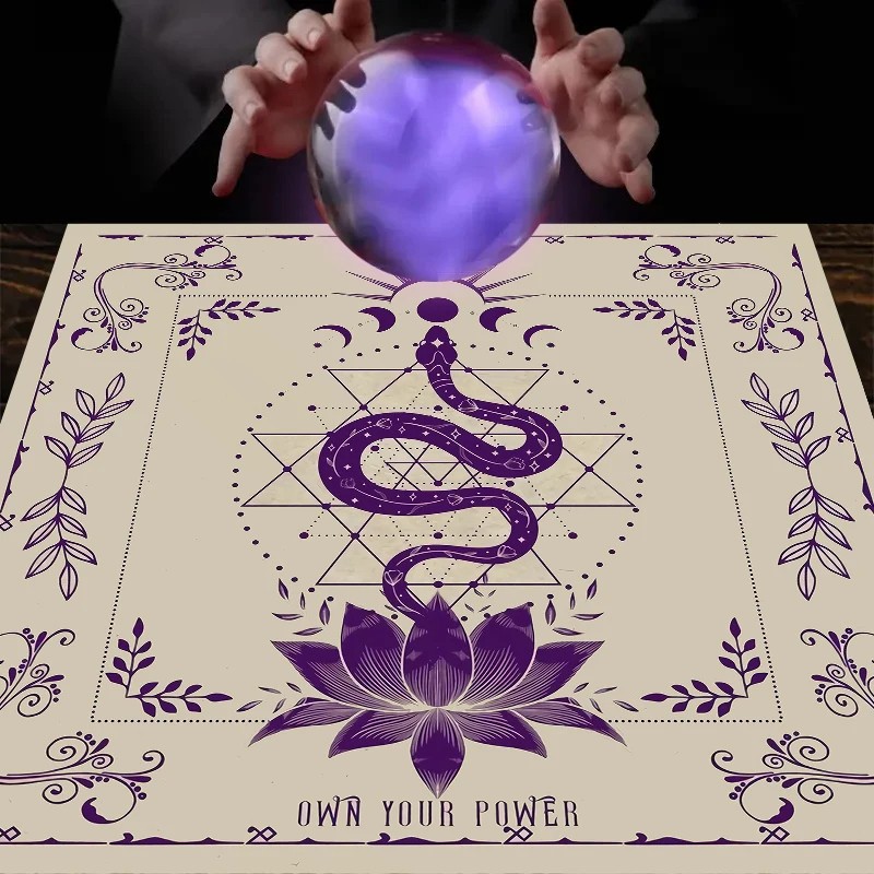 Tämä violetti pöytäliina tarot-motiiveilla ja käärmeaiheella kooltaan 75 x 75 cm on täydellinen lisä kaikille, jotka etsivät esteettisesti näyttävää ja toiminnallista elementtiä hengelliseen tilaansa. Suurempien mittojen ansiosta se sopii paitsi pöydille, myös erityisesti alttareille ja paikoille, jotka on tarkoitettu rituaaleille, meditaatioille ja korttien tulkinnalle. Käärmeaihe symboloi muutosta, voimaa ja viisautta, mikä vahvistaa hengellistä tunnelmaa jokaisessa käytössä. Pöytäliina on valmistettu laadukkaasta materiaalista, joka on kestävä, helppohoitoinen ja samalla elegantti. Runsas violetti väri yhdistettynä mystiseen printtiin vetää huomiota ja tuo tilaan ainutlaatuista salaperäisyyttä.