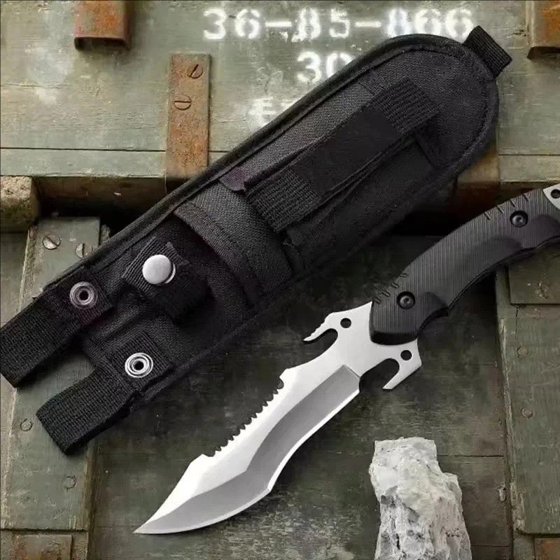 Taskuveitsi ruostumattomasta teräksestä 22,8 cm, tuppi, kaksiteräinen yhdistelmäterä, ulkoilu- ja selviytymisveitsi, taktinen veitsi, retkeilyveitsi