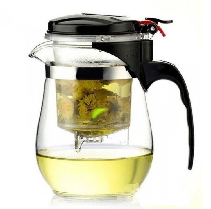 Teekannu, jossa on suuri suodatin teen hauduttamiseen.